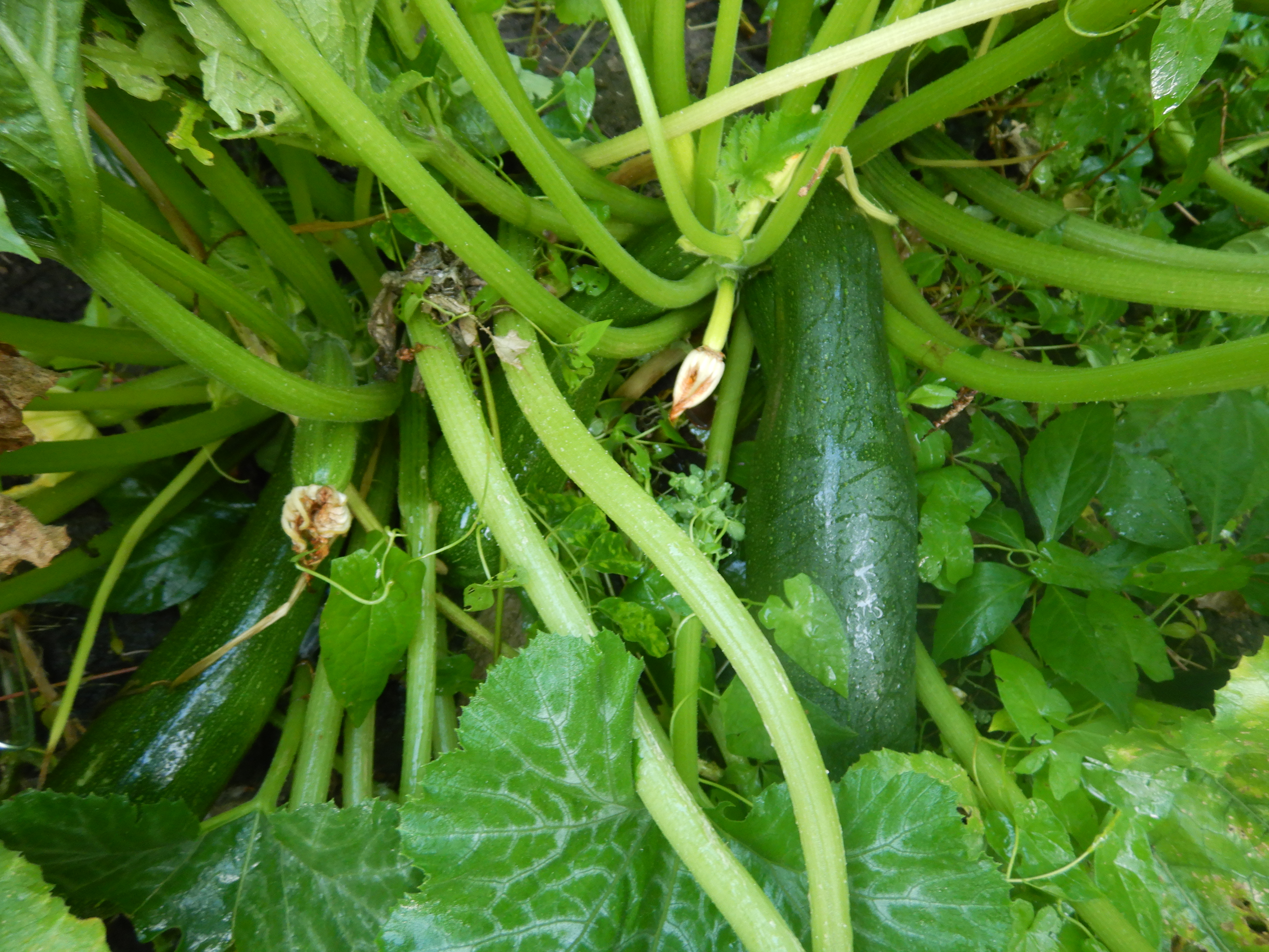 Drie groene courgetten zijn flink aan het dikken en dat wordt courget in zoet/zuur.