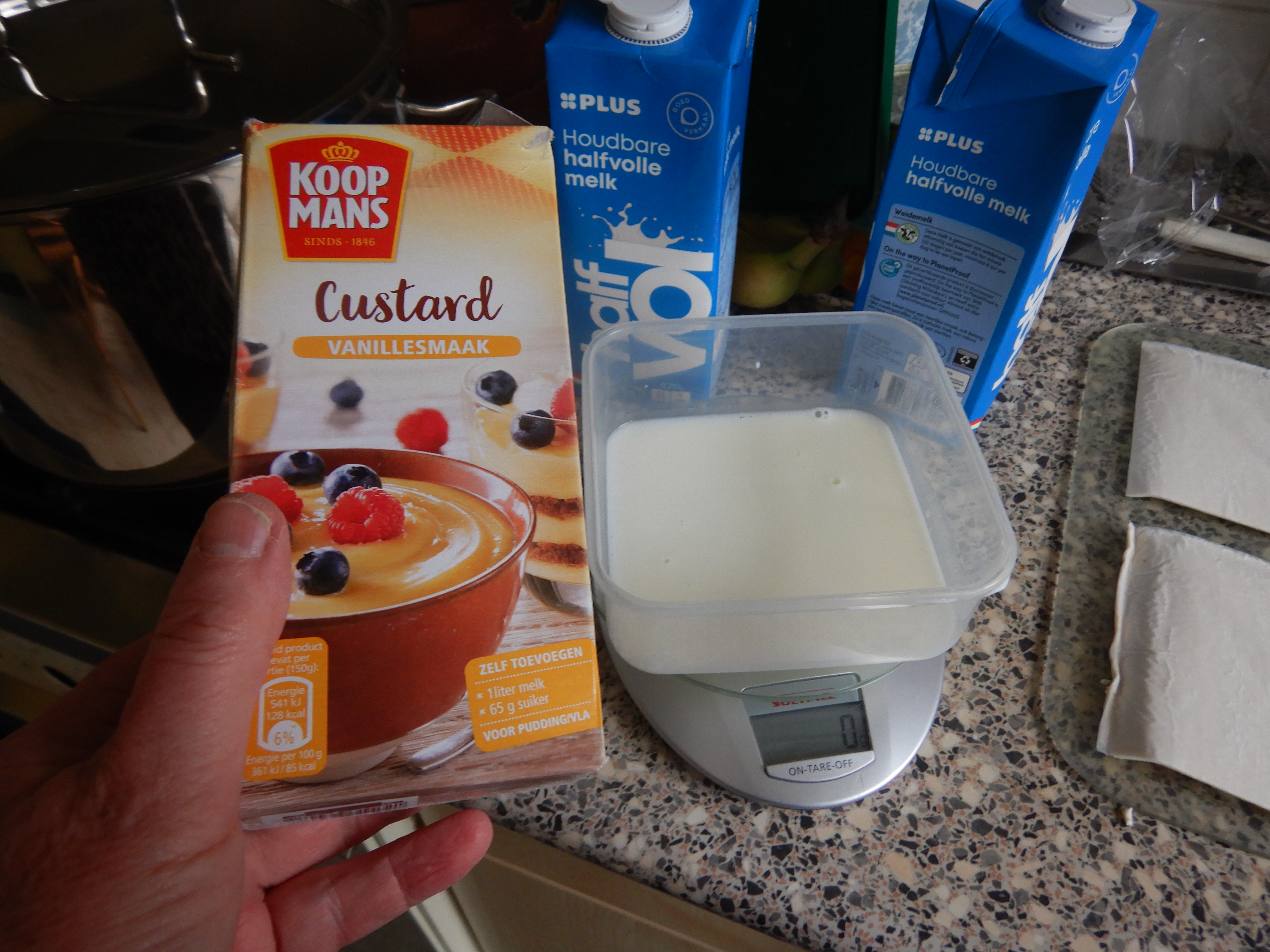 Een deel van een halve liter melk werd gemengd met 35 gram custard en een eetlepel suiker.